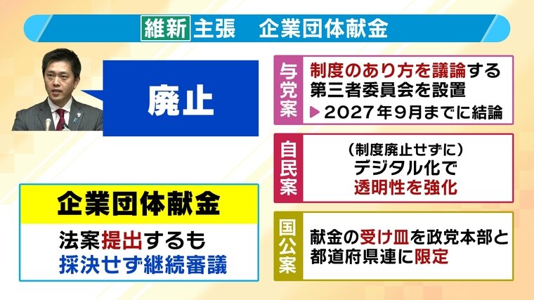 ―――企業団体献金について、維新は「廃止」を訴えていますが、自民は「デジタル化で透明性の強化」など各党で意見が分かれています。今後、折り合いは付くのでしょうか?