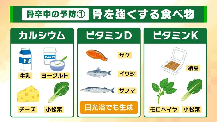 どうすれば骨卒中を予防することができるのか?まず大切なのは食事です。骨を強くする食べ物として、カルシウム・ビタミンD・ビタミンKが大切だということです。