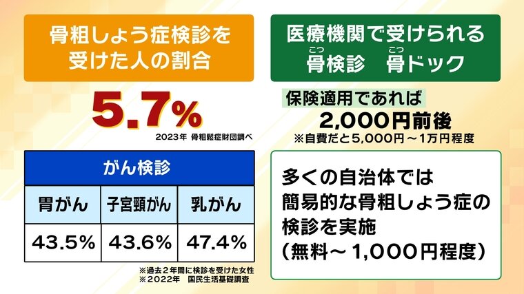 また、自分の骨の状態を把握することも大切かもしれません。骨粗しょう症検診を受けた人の割合は5.7%にとどまっていて(2023年骨粗鬆症財団調べ)、がん検診と比べると数字の低さが際立ちます。