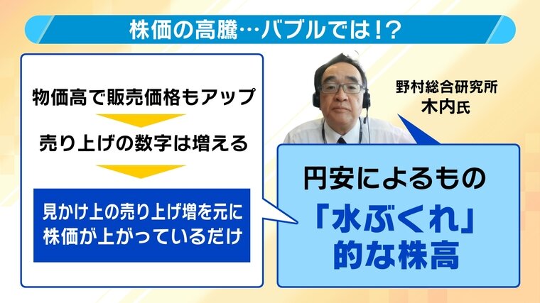 あらゆるものを輸入に頼る日本では、昨今の円安で物価高が進み、それに伴って販売価格が上がって売り上げの数字は増えている、その「“見かけ上の売り上げ増”を元に株価が上がっているだけ」だと言うのです。