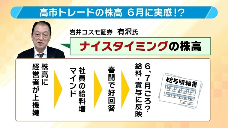 今回の株高を「ナイスタイミング」と言うのは有沢氏。株高で経営者が上機嫌となり、社員の給料を増やすマインドになっていて、春闘で好回答が得られると、6~7月ごろ給料・賞与に反映されるという可能性を指摘しています。