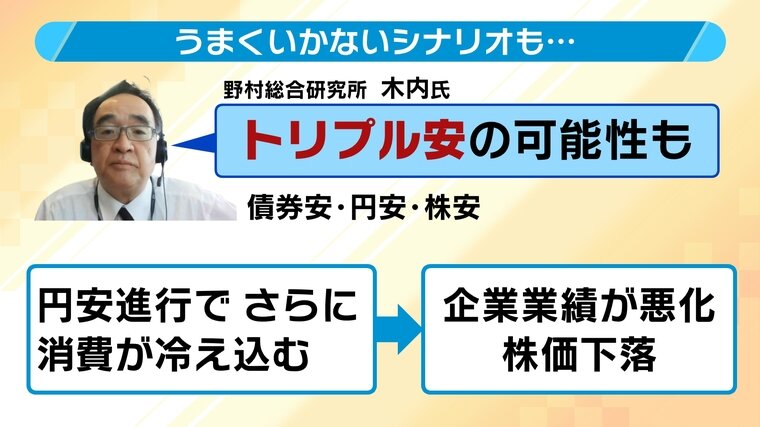 一方、「債券安・円安・株安の“トリプル安”の可能性も」と、うまくいかないシナリオに言及しているのが木内氏。円安の進行でさらに消費が冷え込み、企業業績が悪化。その結果、株価が下落するという見方です。