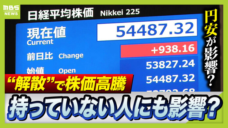 1月14日、東京株式市場で日経平均株価が5万4000円台で取り引きを終え、過去最高値を更新しました。その後どう値動きするかはわかりませんが、上昇局面を見せたことは間違いありません。 背景には衆議院の解散報道があるとされていますが、なぜ、ここまで“株高”が進んだのでしょうか?一方、外国為替市場では円を売る動きが続き、円相場は一時1ドル=159円台半ばをつけるなど、急速に“円安”が進みました。 「株高」と「円安」。よく耳にする言葉ですが、暮らしにはどのような影響があるのでしょうか?岩井コスモ証券シニアアナリスト・有沢正一氏、野村総合研究所エグゼクティブ・エコノミストの木内登英氏への取材をもとに、MBS前田春香アナウンサーが解説します。(2026年1月15日放送 MBSテレビ「よんチャンTV」」より)