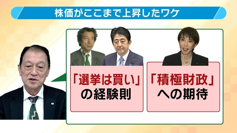 岩井コスモ証券シニアアナリスト・有沢正一氏は、「“選挙は買い”の経験則」「積極財政への期待」が株価上昇の背景にあると指摘。