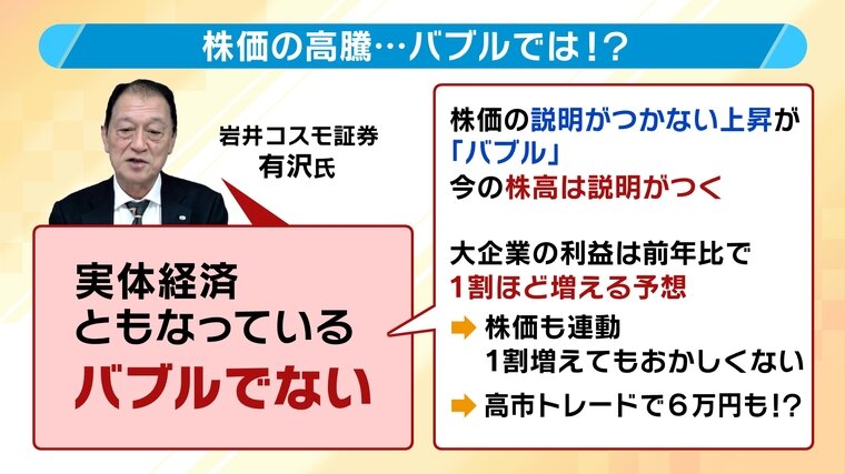 今回の株価高騰について有沢氏は、「実体経済を伴っている。バブルでない」と指摘。今の株高は説明がつくため「バブル」とは言えないとの見方です。