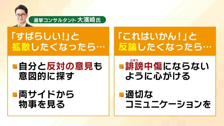 私たち有権者はどのようにSNSと向き合えばいいのでしょうか?拡散したくなった場合、反論したくなった場合、それぞれの対応を大濱崎氏に聞きました。