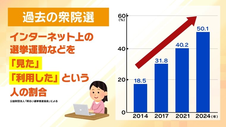 過去の衆院選を振り返ると、インターネット上の選挙運動などを「見た」「利用した」という人の割合はここ10年ほどで急増。2024年には約半数にのぼっています。