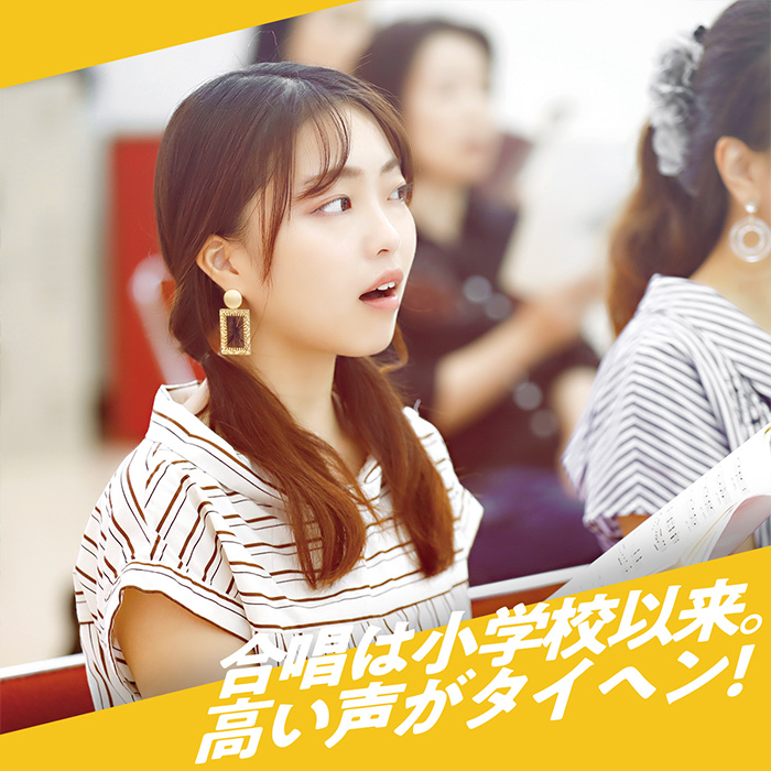 クラシックバレエを習っているだけあって、歌う姿勢もひときわ美しい大学生。「合唱は小学校以来。高い音を出すのが、タイヘン」。お母さんがテレビで観てとっても参加したそうだったので、自分も挑戦してみたくなった。レッスン後の母とのランチも楽しみのひとつ。