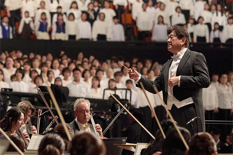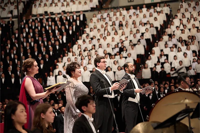 ただ、ここでふと気づきます。——あれ?テレビなどでよく出てくる合唱団全員で「よろこびのメロディ」を歌う有名な箇所は、まだ出てこない。そう、第九のクライマックスといってもいいあのメロディ(練習番号M)、実は、終楽章が始まって約15分後に出てきます。そこにいたるまで期待をじわじわと高めながら進んでいく構成に、はじめて体験する人ほど驚かされるかもしれません。そこからラストまでは、一気呵成。大きな流れに身を委ねるように、1万人はそれぞれの「フロイデ(よろこび)」を、思う存分、歌いあげました。