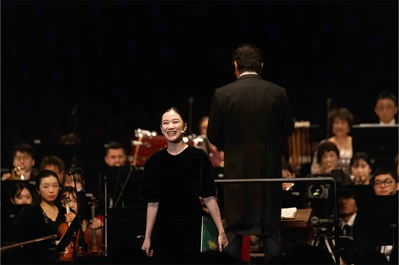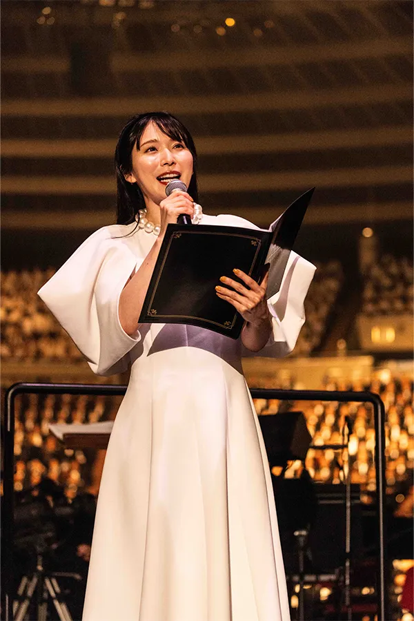 『サントリー1万人の第九』は今年で第43回ですが、ドイツの詩人・シラーの「歓喜に寄せて」の日本語詞を舞台上で朗読するようになったのは、第31回(2013)から。ドイツ語の歌詞をなぞるだけなく、合唱団の誰もがその意味を実感して歌えるようにとの想いからでした。平和について考えさせられることが多かった2025年はより深く、より鮮烈に、ベートーヴェンのメッセージをひとり一人に贈ろうと蒼井優さんがステージに立ったのは第九・第四楽章の直前。「愛の章」と呼ばれるメロディアスな第三楽章が終わり、センターのライトが黒いロングドレス姿の蒼井さんを照らしました。