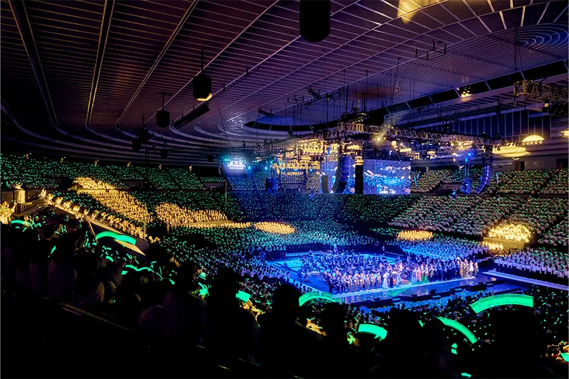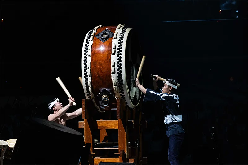 舞台中央、大太鼓が鎮座します。オープニングを飾ったのは、佐渡ケ島(新潟県)を拠点に、国際的なパフォーマンスを魅せる太鼓芸能集団 鼓童の皆さん。一打が放たれた瞬間から、空気が一気に変わります。“音”というより“心臓の音”そのものが身体中に流れ込んでくるよう。大迫力の『大太鼓』に続いて、笛や太鼓を鳴らすメンバーがアリーナ席に姿をあらわします。まるで和のパレードが会場を横切っていくような高揚感のもと『結』が賑やかに響き渡りました。