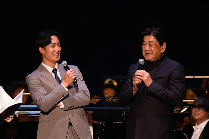 関西の方は予想していたかもしれないサプライズ。シークレットゲストは、今年のプロ野球界でリーグ優勝を飾った阪神タイガースから小幡竜平選手。佐渡さんの表情がいっきに緩みます(楽屋でツーショットを撮ったと嬉しそうでした!)。『ラデツキー行進曲』からのアレンジで『六甲おろし』が演奏されると、大阪城ホールが球場かというほど大合唱がはじまりました。合唱席には、タイガースタオルなど応援グッズを掲げている方も。さすが関西です。この様子をはじめて目にした松岡茉優さんは驚き、「あんなにスルっと(六甲おろしの歌が)出てくるもんなのですか?」と尋ねると、「(関西人の)遺伝子に組み込まれていますから」と三ツ廣アナが答えました。