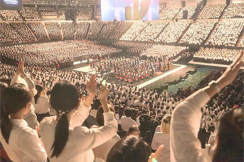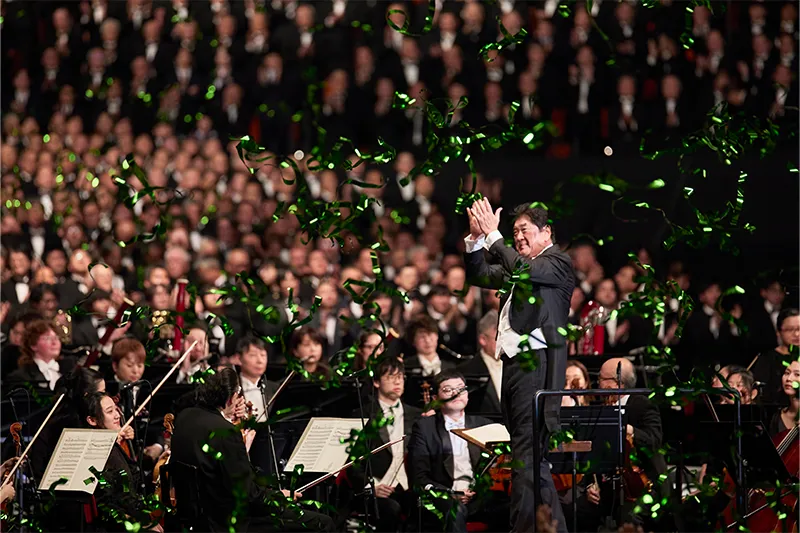 約20分間の大合唱が終わり、オーケストラがエンディングを奏で終えた瞬間、大阪城ホールにグリーンのリボンが舞い飛びます。言葉にならないあたたかな感動に包まれ、自然と涙があふれます。