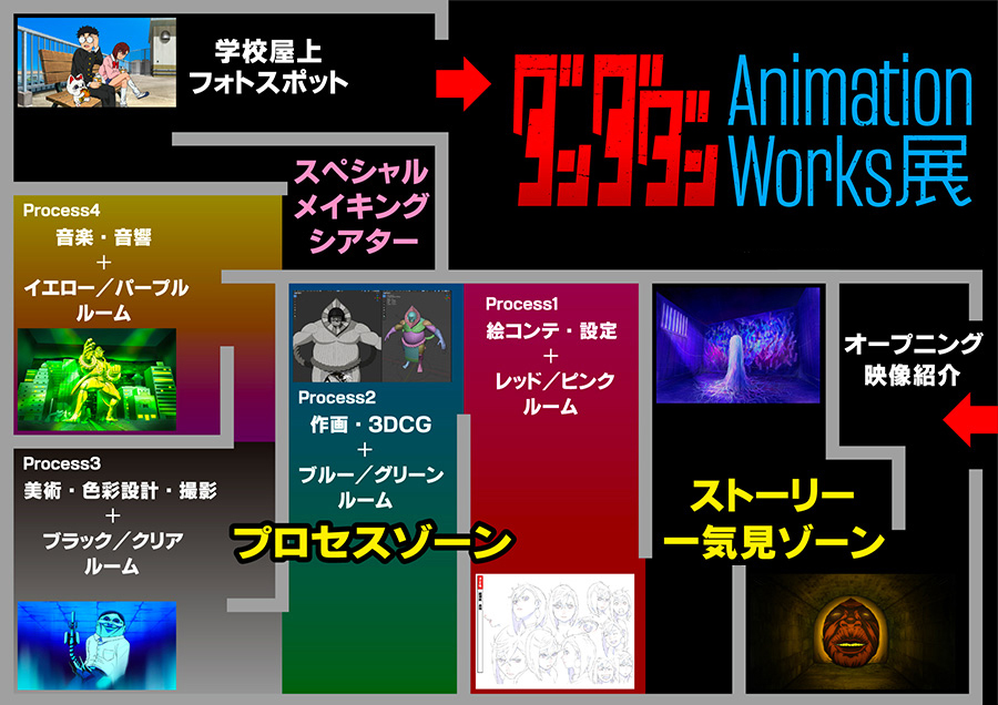 【絵コンテ・設定】【作画・3DCG】【美術・色彩設計・撮影】【音楽・音響】4つのゾーンで構成。