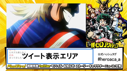 番組放送中にハッシュタグ「#heroaca_a」が入った応援ツイートをつぶやくと、キミのツイートが画面上で表示されるぞ!(全てのツイートが表示されるわけではありません。) テレビ画面でもツイッターを楽しもう! |
