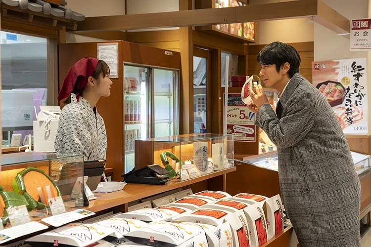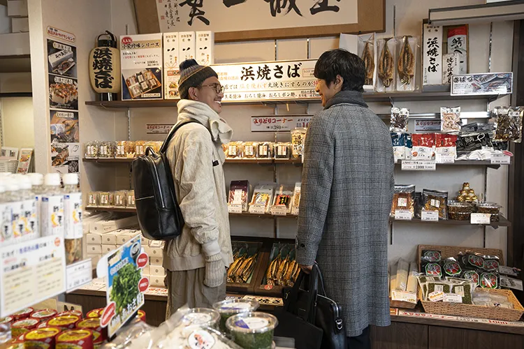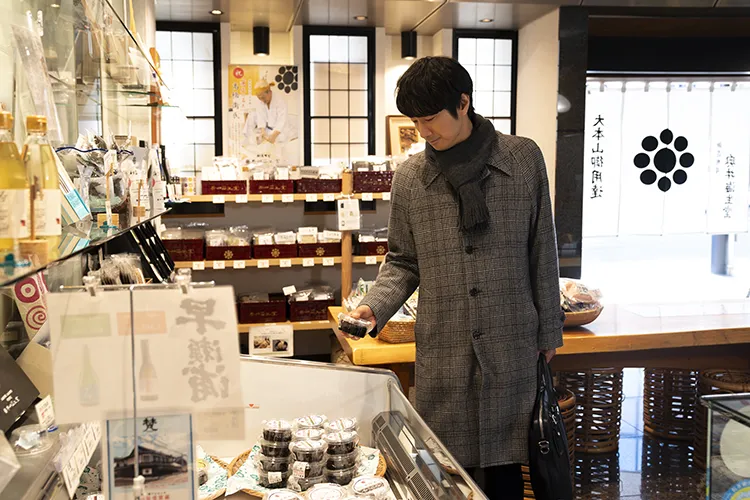 福井駅前で恐竜の像を見上げる高宮進。仕事を終え街中に出ると、敦賀で出会った志偉と偶然再会。2人で200年以上の歴史ある酒蔵を訪れ、定番の日本酒を手に入れる。一緒に福井城址を散歩中、離れて暮らす家族のことを思い出す志偉。志偉と別れ一人になった進は、日本の三大珍味の1つとされる越前仕立て汐うにと、福井の銘菓・羽二重餅を購入。そして、小鯛のささ漬、へしこのおにぎり、若狭梅酒を仕入れたら、福井セットの完成だ。