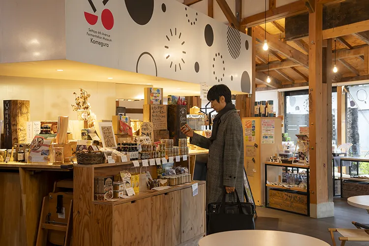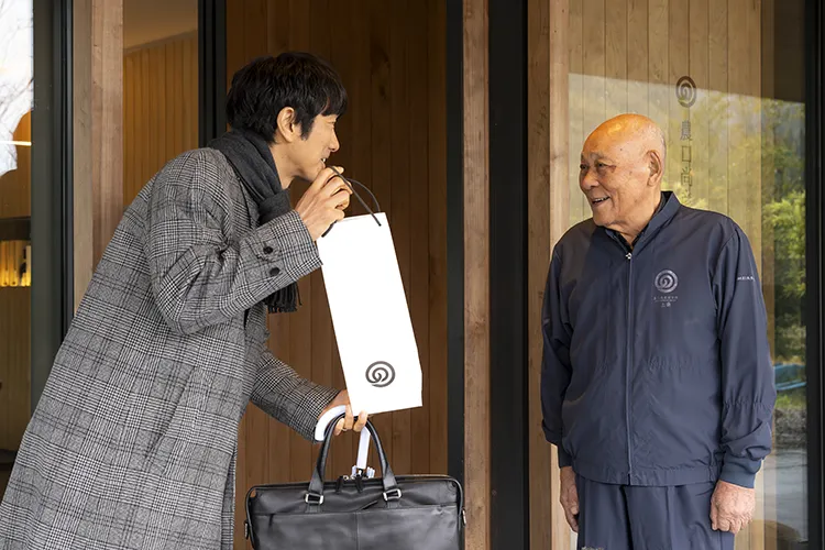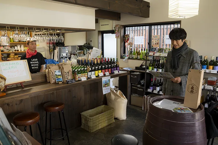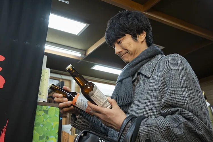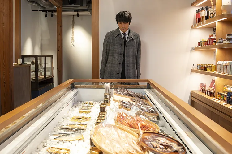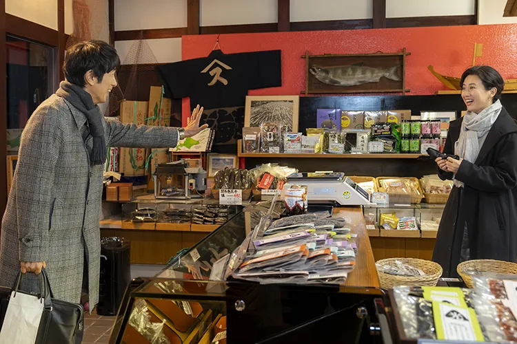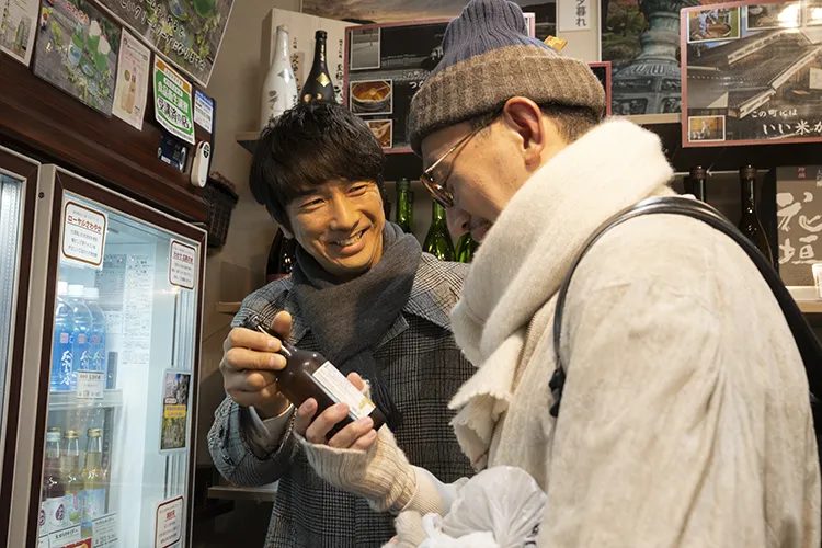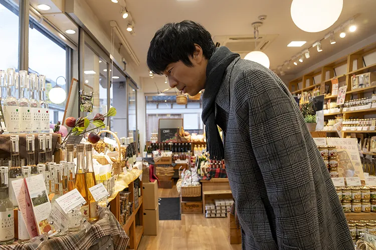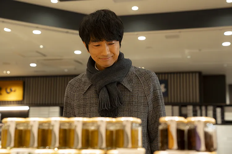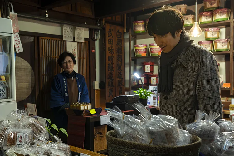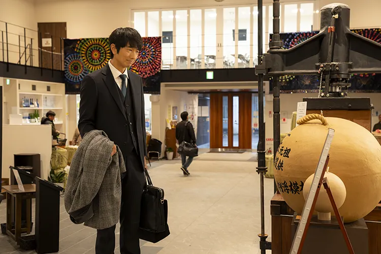 小松駅の近く、こまつの杜にあるショベルカーの前で見栄を切る高宮進。仕事の後、踊るような足取りで向かったのは、酒造りの神様・農口尚彦の酒蔵、農口尚彦研究所。モダンな店内に並んでいる日本酒の中から定番の本醸造を選ぶ。酒の肴を仕込みに、古い町家が残る通りを歩いていると、農口尚彦研究所で見かけた枝野ひかりと出会う。そして、江戸時代末期創業、加賀の珍味や乾物を取り扱う店に立ち寄ると、そこにも、ひかりがいた。