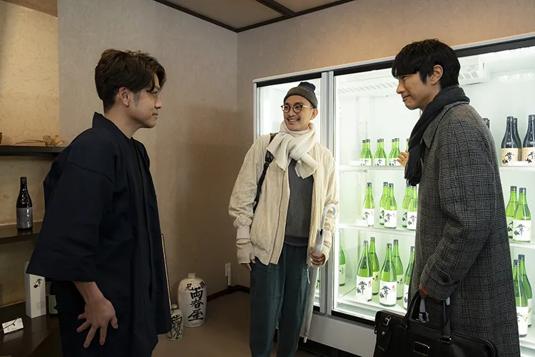 富山駅前の路上で立ち尽くす高宮進。路面電車で港町・岩瀬地区にやって来ると、遠くにいるトランクの男に気づく。進を居酒屋新幹線に誘った師匠に違いないと、男の後を追って入ったのは酒屋。店主に薦められて純米大吟醸を買い、富山湾展望台に行くと、目の前に広がる雄大な絶景に圧倒される。その後も、白えび天ぷら、ほたるいか粕漬、かじきの昆布〆、特選ますのすしなど、立山連峰の雪解け水が育んだ酒と肴を仕入れるのだった。