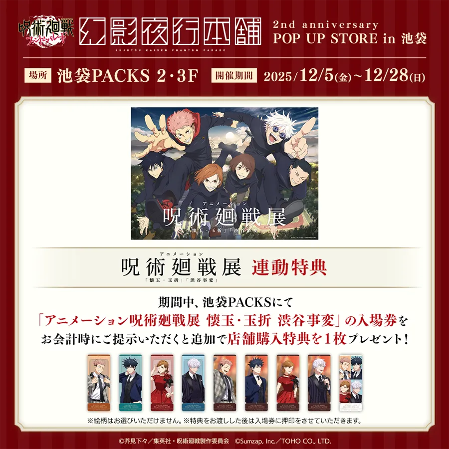 期間中、池袋PACKSにて幻影夜行本舗 店舗取扱商品を1点以上ご購入の際に、本展覧会入場時にお渡しする『紙入場券』をご提示で【店舗購入特典チケット風カード(全9種)】を1枚プレゼント!