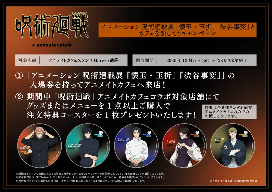 アニメイトカフェスタンドHareza池袋にて取扱商品またはメニューを1点以上ご購入の際に、本展覧会入場時にお渡しする『紙入場券』をご提示で【注文特典コースター(全5種)】を1枚プレゼント!