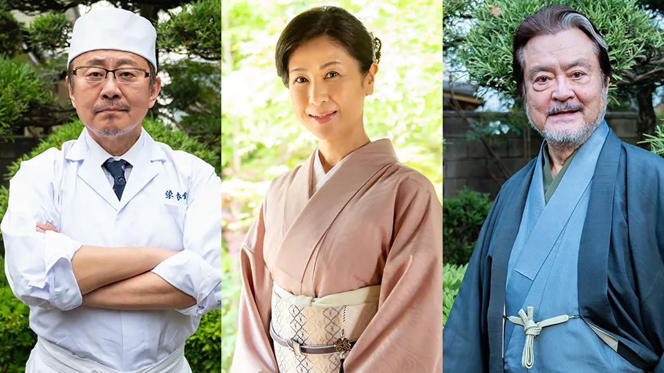 板長・桐谷讓役を演じるのは、俳優、タレント、ナレーター、コラムニスト、折り紙作家等幅広く活躍する松尾貴史!仲居頭・藤川須磨子役には、朝の連続テレビ小説「おしん」で主人公を熱演し、以降ドラマや映画、舞台と数々の作品に出演する小林綾子!そして大旦那・染谷和寿を務めるのは、「藍より青く」「水戸黄門」など数多くの作品で注目をあつめ、現在は舞台演出や映画監督、エッセイストなど多方面に活躍中の大和田伸也!
