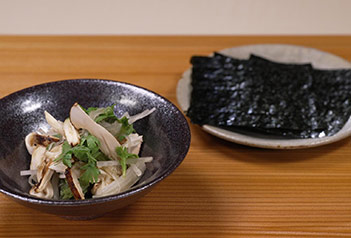- ボウルで大根、②の松茸を和えて、醤油とカボス汁で味を調える。菊菜をざっくり和えて、器に盛る。