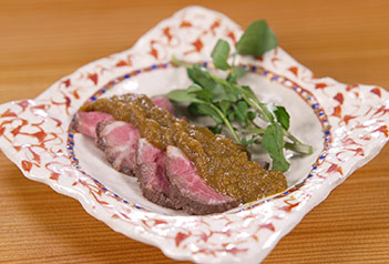 - 肉を薄切りし、クレソンなどと共に器に盛りつけ、ソースをかけたら出来上がり。
