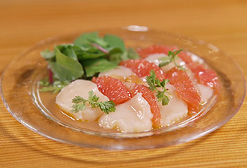 - ベビーリーフを盛ってホタテを盛り付ける。③の果肉を先に盛って、汁をかける。チャービルを散らしたら、出来上がり。