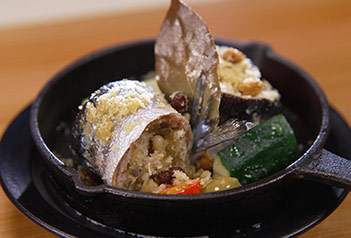 - サンマは三枚におろし、腹骨をとる(できれば三枚におろすときに片方に尾をつけて。血合い骨はとっても取らなくても良い)。プチトマトは半分に切る。ズッキーニは棒状に切る。