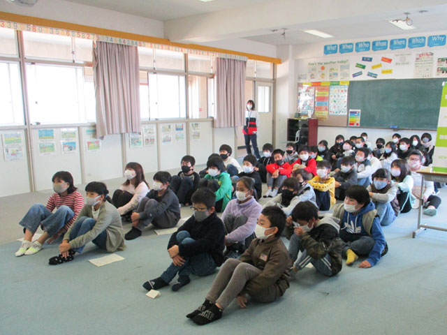 古川橋小学校では、視聴覚室に2クラスの皆さんに集まっていただいて、皆さんはマスク、我々もフェイスガードなど対策十分でやらせていただきました。