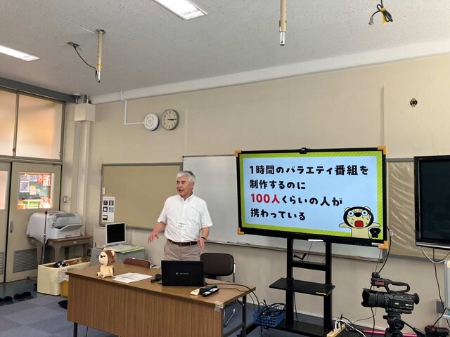 (田中講師)「さて、ここでクイズです!ゴールデンタイムの1時間のスタジオ番組に、関わっているスタッフの人数は、だいたい、30人、70人、100人、どれでしょうか?」(児童たち)『30人!』『70人!!』『100人!!!』(田中講師)「一番多かったかな、正解は100人です!!!」