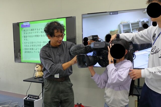 2コマ目の授業は、元報道カメラマンの工藤講師の担当。ヘリコプターや最近撮影の機会が多いドローンを使った撮影について解説しました。