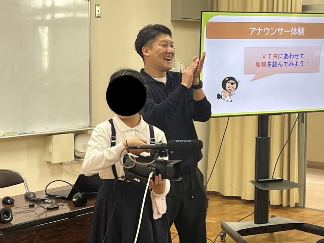 1コマ目は、報道カメラマンとして上海支局に赴任していた飯坂講師による「ニュースができるまで」の授業です。児童のみなさん、とてもよくニュースを見ていましたよ。最近のニュースからの質問にも、「熊!」「高市総理!」と即答&パーフェクト。最近のできごと、とてもよく知っていました。今回は特別メニューとして、アナウンサー体験だけでなく「カメラマン体験」も実施しました。「たくさんの人が集まってる感じに撮るには?」と映像の表現についても学びました。