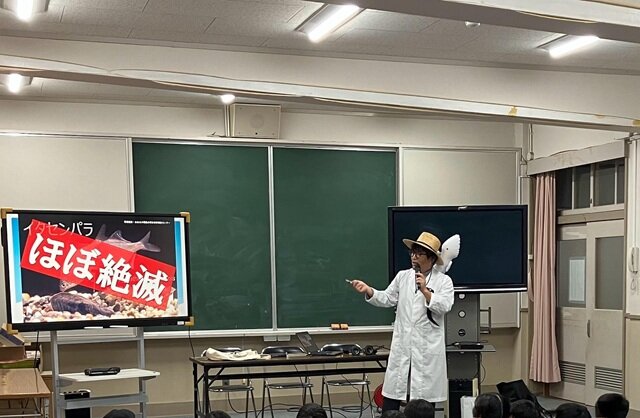 1コマ目は、MBSのお魚博士。尾嵜講師の担当。部屋に入るとき、教室の外から見ただけでもたくさんのキラキラした目が光っていました。これだけ感度の高い小学5年生は初めてです。まず生き物が好きかを聞いたときのリアクションが素晴らしかったです。最初にテレビのお魚博士が生まれるまでを自己紹介ふくめて簡単に紹介し、いきものの名まえ当てクイズから入りました。そして、毎日放送の番組で発見のきっかけとなったクニマスの話、深夜バラエティ番組で初めて見つけた道頓堀川のニホンウナギの話など、番組で扱ったいきものとその情報の出し方について取り上げ、やらせと思われがちな企画のリスクに対し、テレビで科学をどう正しく伝えるか、についてどんな取り組みをしているかをお話しました。