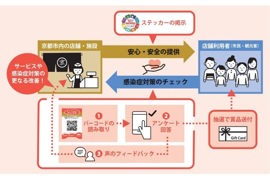 2020年9月10日(木)より開始される「きょうの安心・明日の笑顔~新型コロナウイルス感染症対策・応援プロジェクト」で、京都市民や観光客が安心・安全な京都を守る応援団になるというもの。皆さんが京都市内の飲食店や宿泊施設を訪れた際に、それぞれの店舗や施設が実施する衛生対策についてウェブ上で評価することで感染症対策の強化につなげるという画期的な取り組みです。