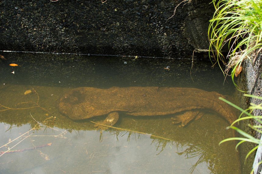 実は、オオサンショウウオの噛む力が強力で、小指くらいなら噛みちぎることができるそうで、もし見つけてもむやみに触らないほうがいいです。