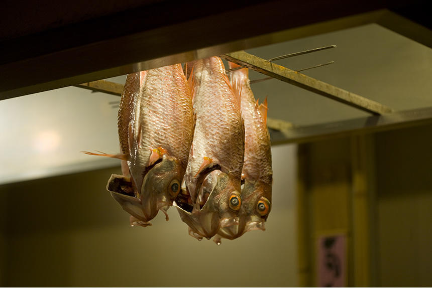 多くのお客が注文するのが、2種類の炉を使った自慢の炭火焼料理。のどぐろ、笹かれい、きんきなど、市場や城崎・津居山の魚屋から仕入れる季節の魚介は、自家製の一夜干しでも楽しめる。写真は香住産のノドグロを厨房で干している様子。半日かけて旨味だけを残すように水分を抜いていく。ある程度水分が抜ければ、その場で焼いてもらうことも可能だ。