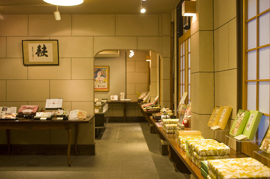 店舗は築約120年の町家を生かしたもので、横の洋館が販売店舗となっている。建物奥の茶房へ繋がる通路には、昔ながらのおくどさんや調度品などが見られる。