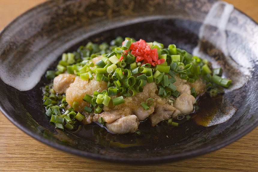 鶏もも肉一枚を天火で焼いたあと、炭火で軽くあぶり、おろしポン酢でさっぱりと仕上げる。皮はパリッと、身はジューシーで柔らかく、まろやかで少し甘めの自家製ポン酢と相性抜群。トッピングのネギと紅ショウガの風味や食感もアクセントになっている。