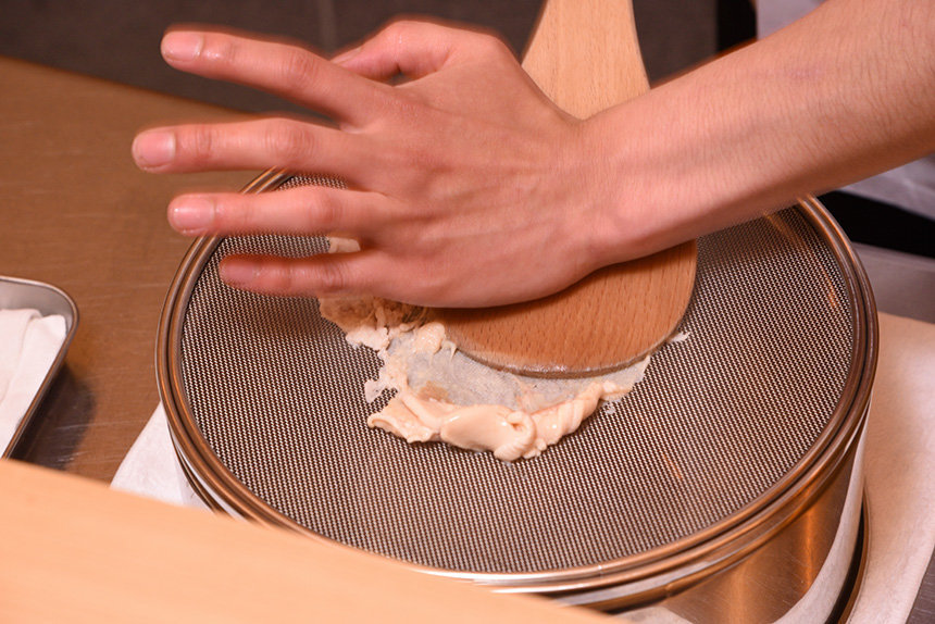 まずは白子の味噌漬を裏ごしします。そのままでは少し固いので、鯛のアラからとったスープで伸ばします。アラを煮出す場合、臭みを消すためネギや生姜を使うことが多いのですが、このスープは鯛のアラをかつおだしだけで煮出したもの。鯛のうまみがしっかり感じられると思います。