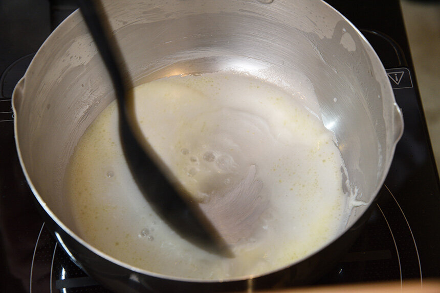 フリットの衣は卵白の効果でふわふわとした食感になりますが、今日はミルクの代わりにココナッツミルクドリンクを使い、衣自体にかすかな甘みを加えました。芯まで完全に火を通さず半生ぐらいに仕上げたいので、ある程度色が変わったら出来上がりです。