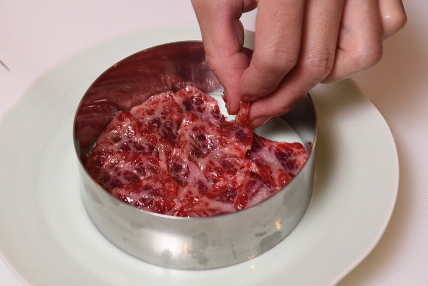京都を代表する和食の料理人に、和食の範疇を飛び出した奇想天外な一皿を作っていただく【割烹知新】。今回は『祇園 おかだ』岡田孝二さんの「鯨の尾の身のカルパッチョ」をご紹介します。