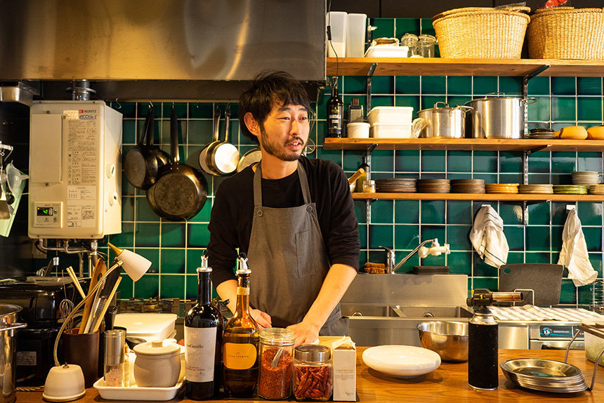 「fudo」のオーナーシェフ入江哲生さんが、2号店として「居酒屋のように気軽な店をつくりたい」と考えていたときに、京都のカフェで腕を奮っていた吉田伸介さんと知り合い、意気投合してこの店の話がまとまった。