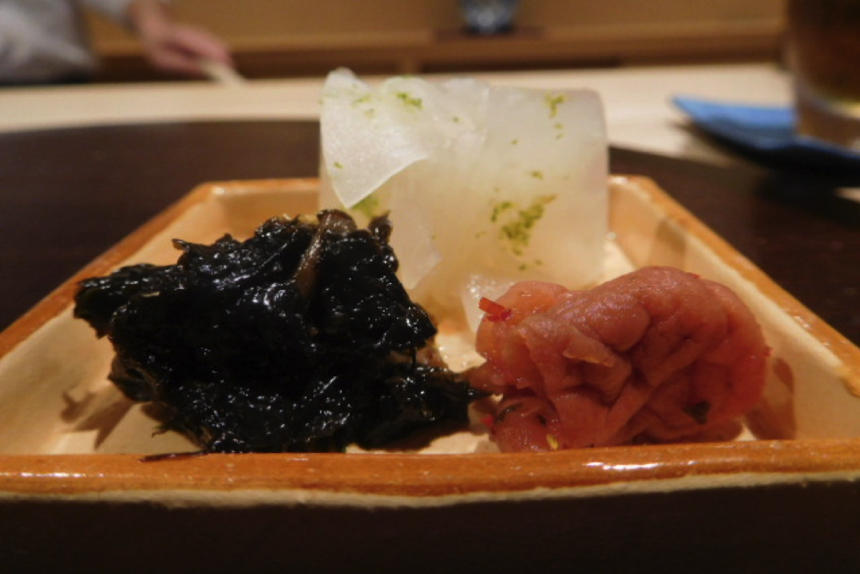 鱧を梅肉だれで食べるのは定番ですが、梅肉にわさびを加えるというオリジナル。酸っぱさと辛さがマッチしていてよく考えられていると思いました。
