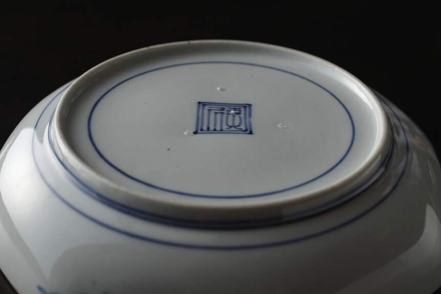 上の皿を裏側から見ると、中央の福の字の中にトチンの跡が小さく残されているのが分かります。このように、中央にトチンを置くと、高台内の装飾と重なってしまうケースも多々見られます。