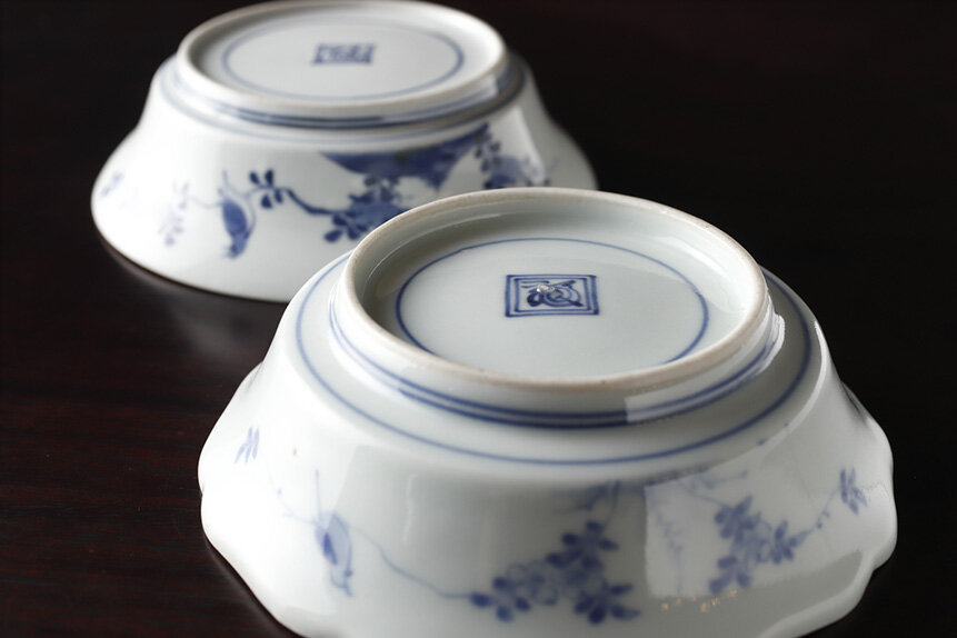 それ故、写真の染付は藍の発色も美しく、その濃淡だけで豊かな表現を実現させています。高台内に残ったトチン跡も極めて小さくし、目立たないよう配慮がされています。また現代の柿右衛門にも記されている「渦福(うずふく)」が残されています。ただしこの「渦福」柿右衛門だけの窯印だと言うことは出来ませんので、ご注意ください。