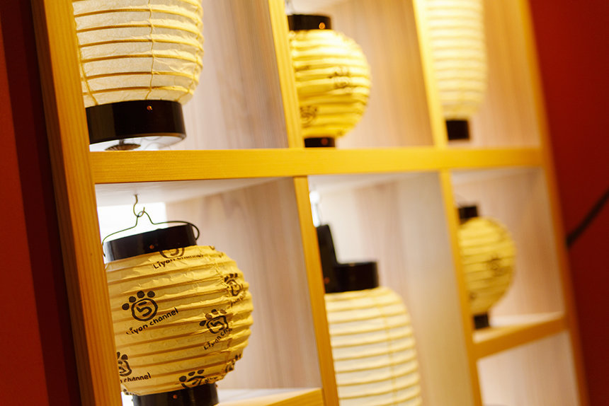 一から手作りで仕上げるという京提灯は、絵ももちろん手描き。正確で美しくありながら、筆の濃淡などの手作り感に温かみも感じます。ブラインドに描かれた絵柄とその前に置かれた提灯とを合わせてみてみると...らいよんチャンが書き損じて墨を飛ばしてしまっています。細かい演出に思わずニッコリ!
