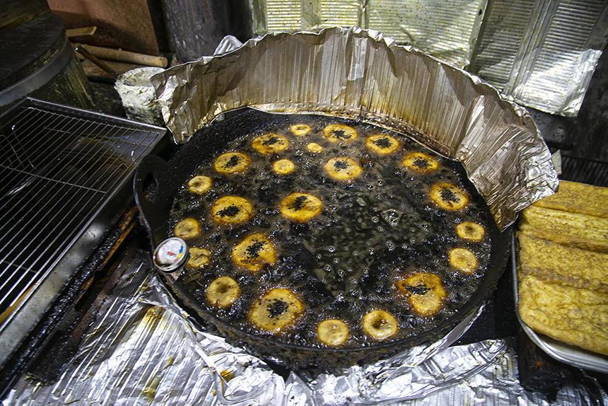 このかまどは大豆炊くだけやのうて、揚げもんにも使てはるんやて。ちょうどひろうす揚げはるタイミングやったし、ちょっと見せてもらいます。