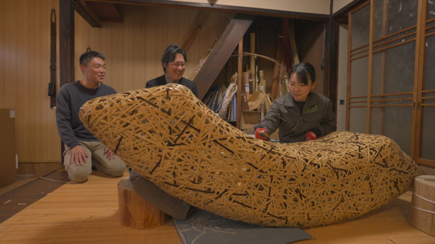 京都の竹材店に依頼し、鳥の巣をイメージした「やたら編みベンチ」を制作。
