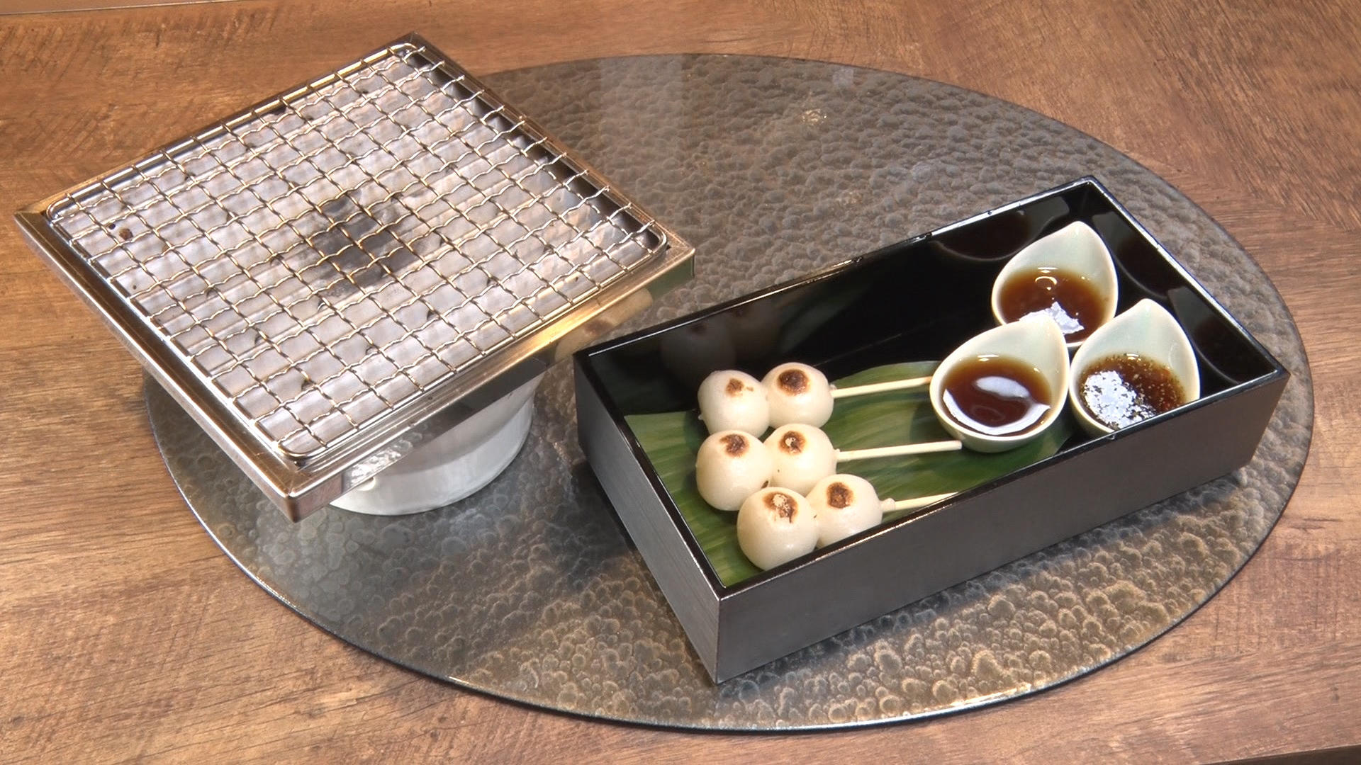 スタジオに届けられたのは「みたらし団子セット」(ドリンク付き 1000円税込)。団子を自ら七輪で焼くスタイルで、タレは一般的なみたらしダレのほかに、お店オリジナルのタレがなんと10種類。ゆずこしょうやバジル、シナモン、カレーにコチュジャンといった、これまでのみたらし団子の概念が覆るような味ばかり。